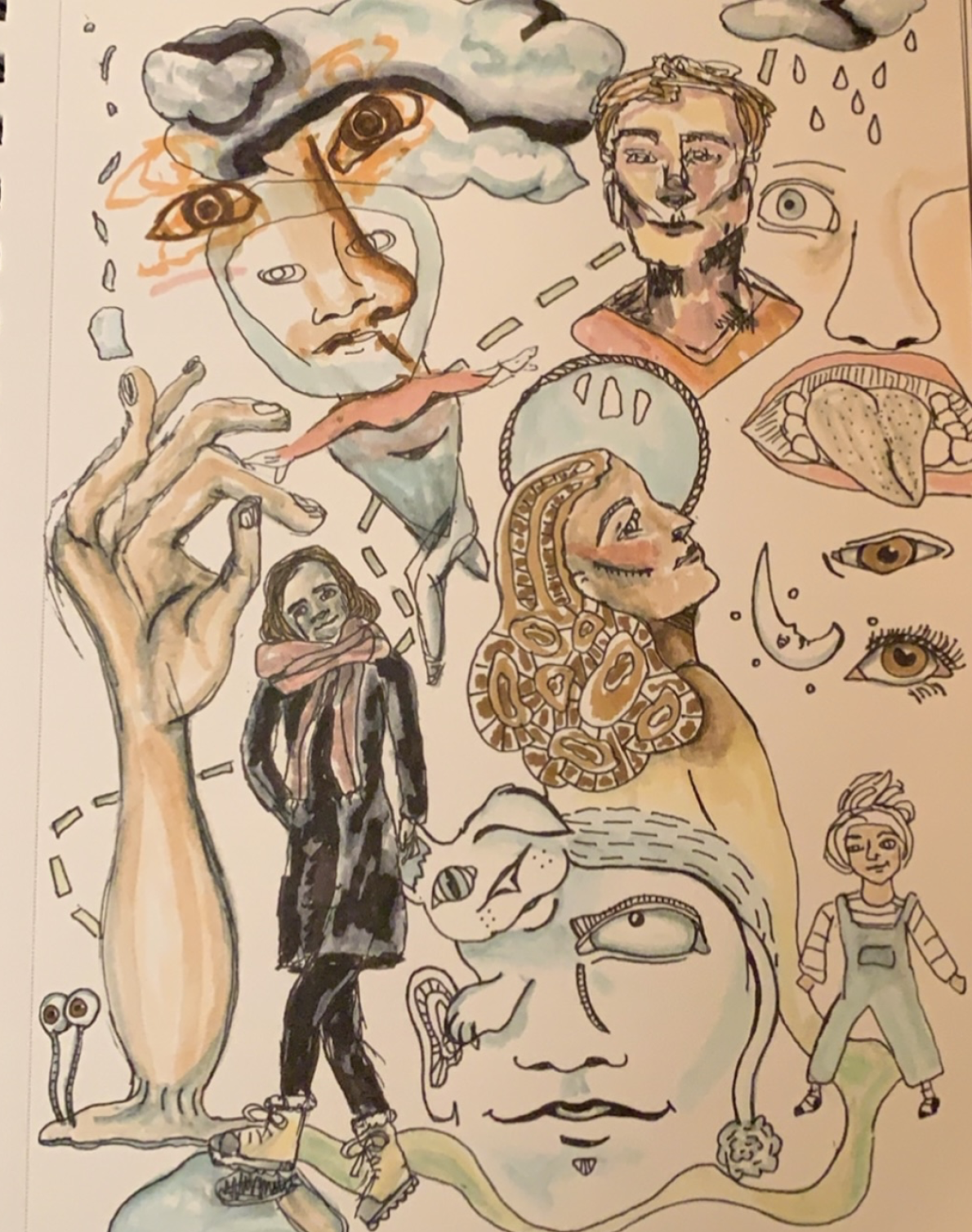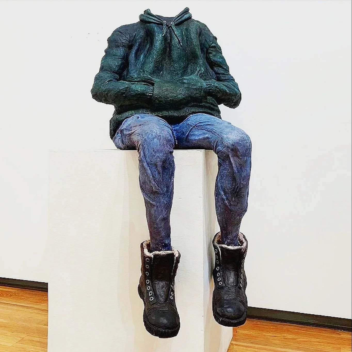 In “Covid Self-portrait”, I tried to depict how I felt I was perceived by the world during the COVID-19 pandemic. I felt as though clothing and posture played a more important role in identifying people than their faces at this time. I wore a green sweatshirt and boots, gained back my freshman fifteen, and wore a mask that kept my face hidden from everyone else. I mimicked the relaxed position which I take when there is nothing else going on, and even hunched the shoulders of my figure like I do when I sit for too long and no longer have good posture.