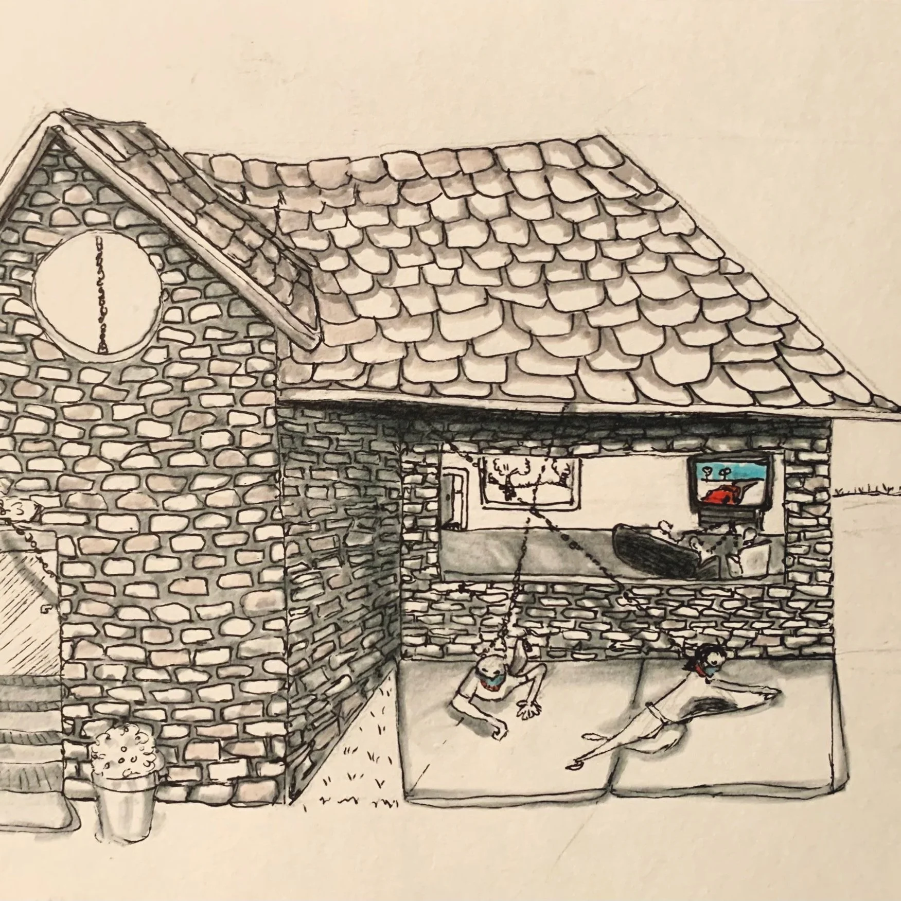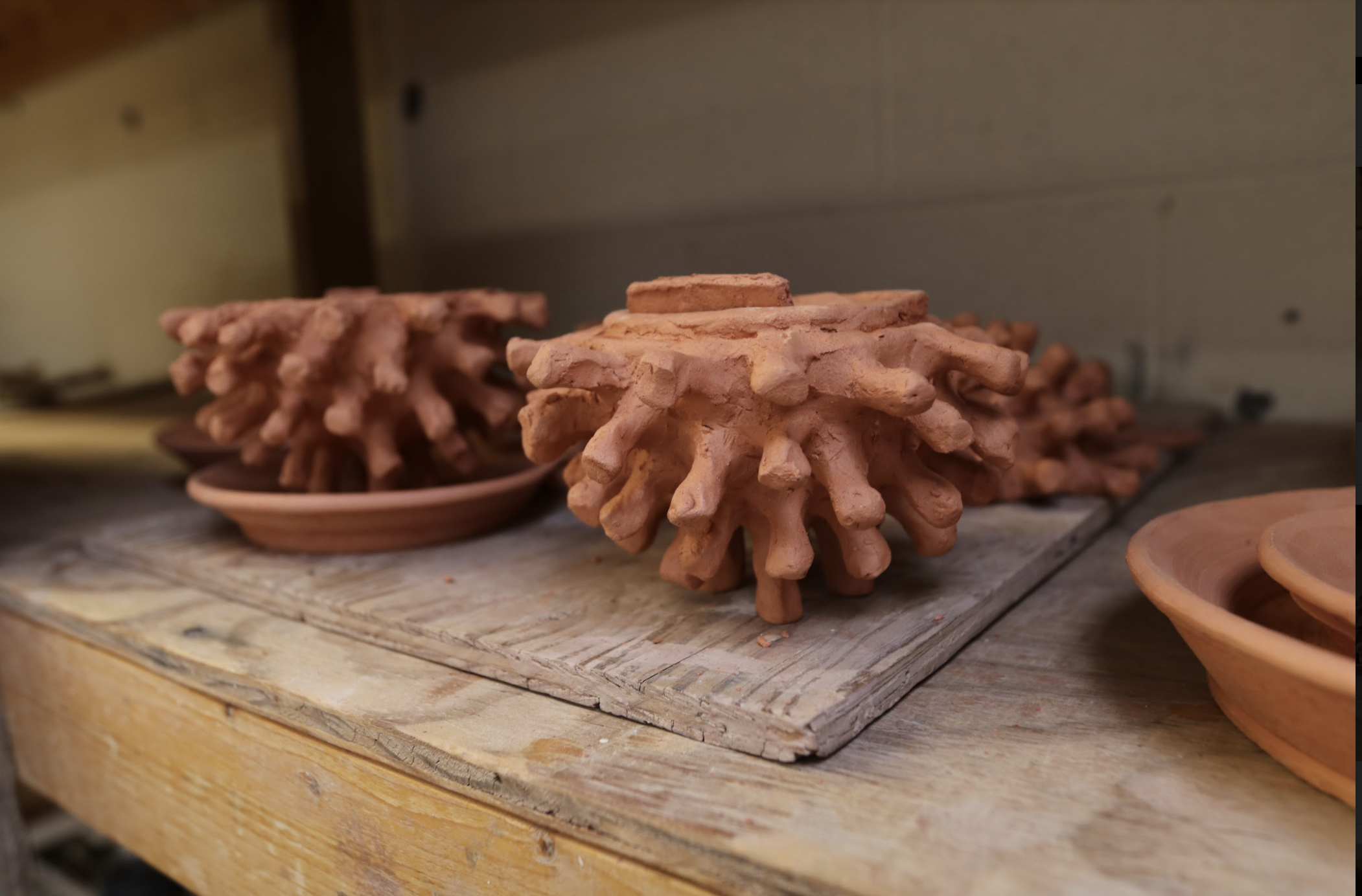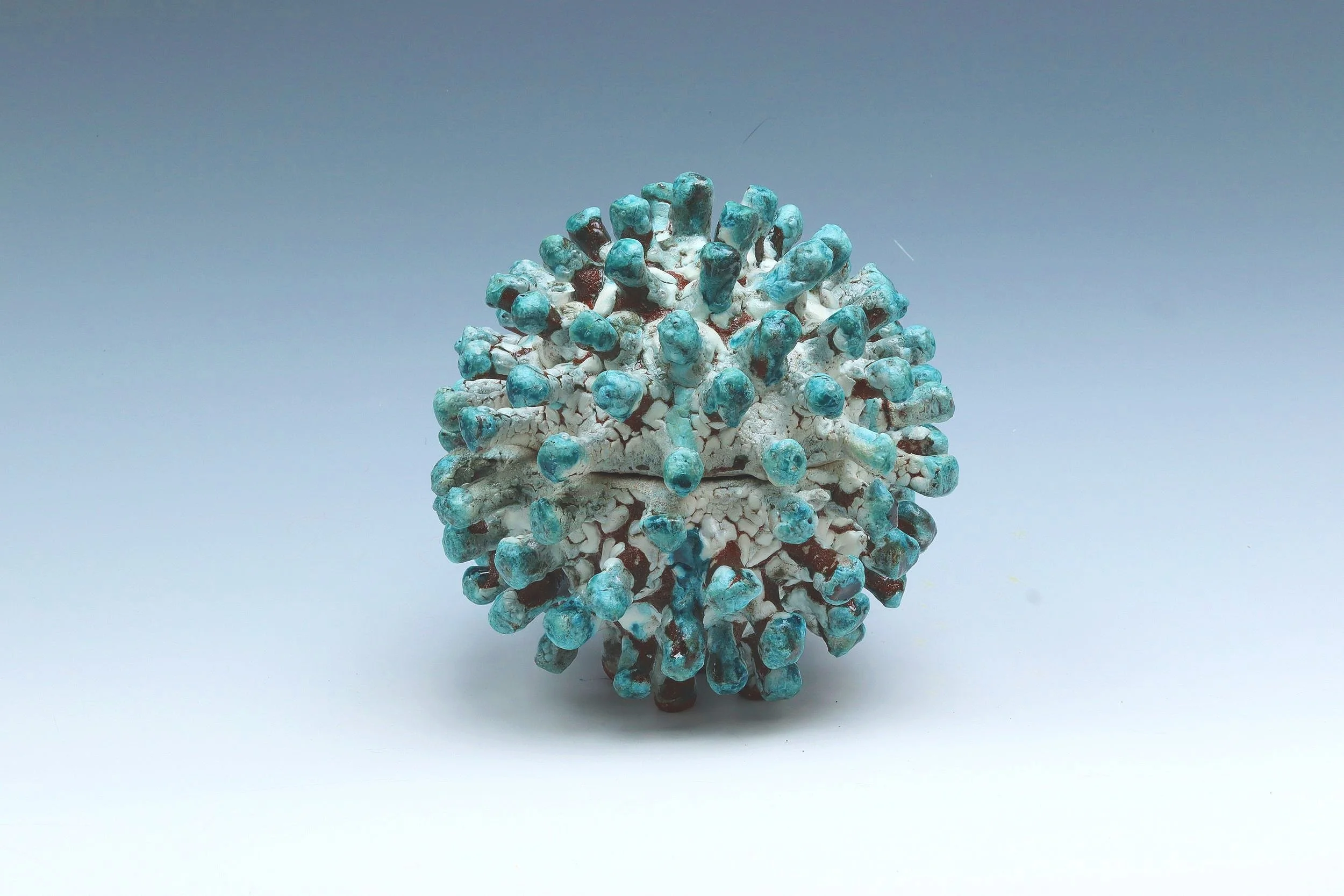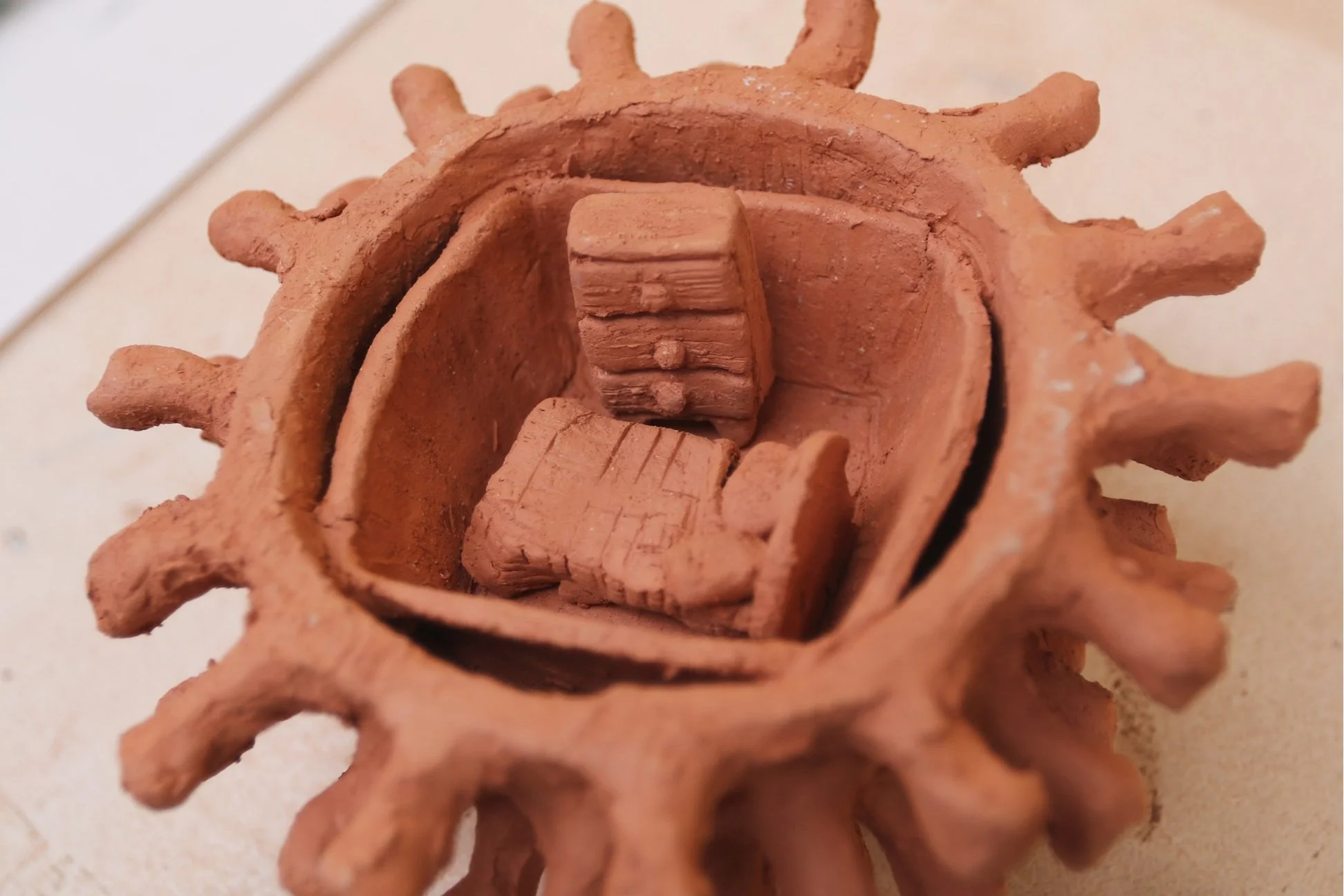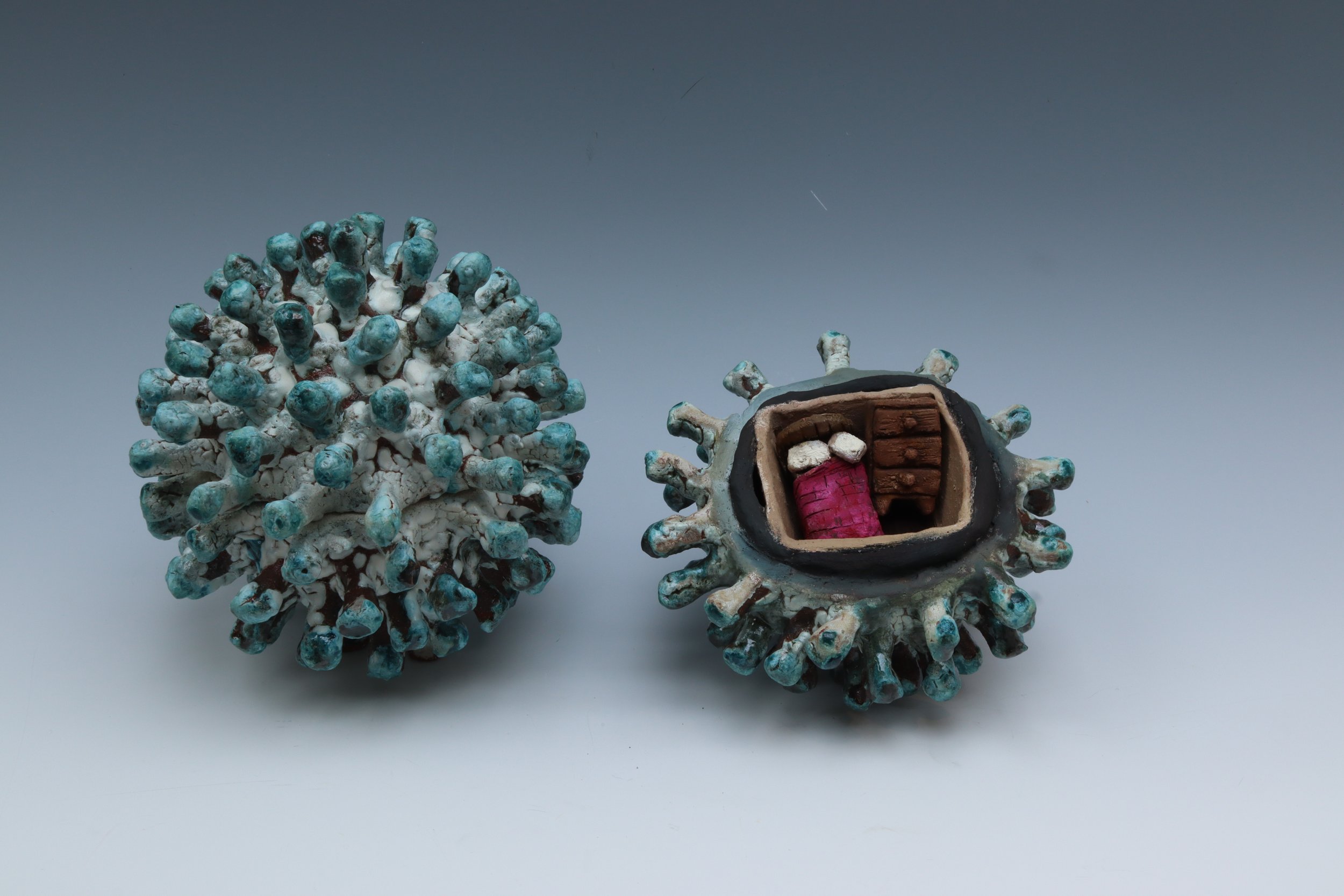 This red body clay piece is a bedroom inside of a coronavirus. I made it as a way to symbolize the fact many people were stuck in a room for years due to COVID-19.