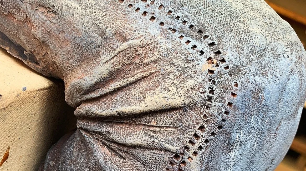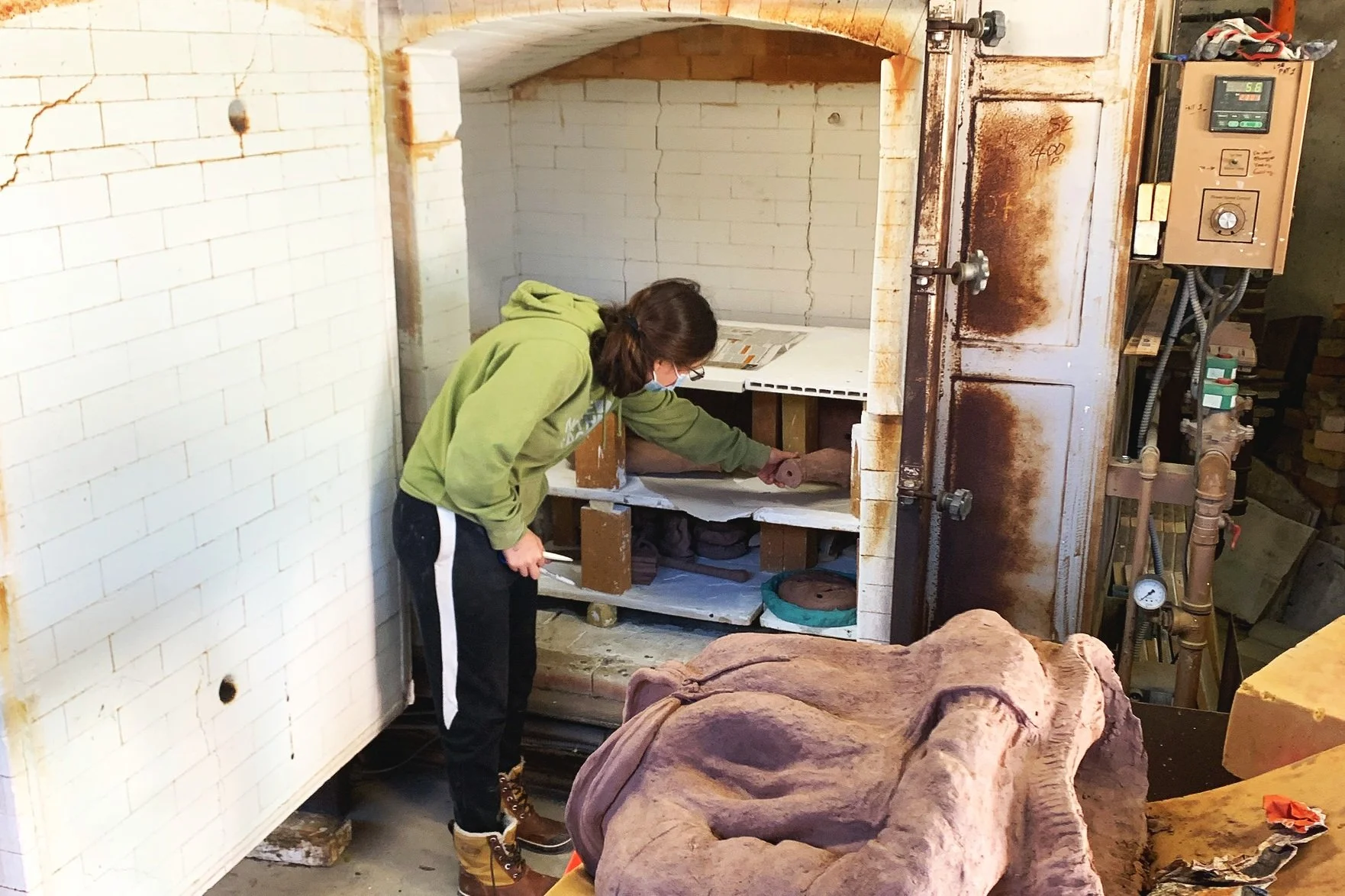 My COVID self-portrait is a ceramic sculpture made out of a combination of thrown vessels and coil building. It is a five-piece sculpture almost as big as I am. This was a laborious process in which I had to climb tables, mold large vessels, and seamlessly fit my sculpture together to make it appear as though it is a person.
